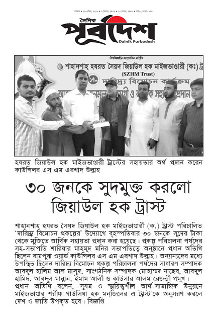 শাহানশাহ হযরত সৈয়দ জিয়াউল হক মাইজভাণ্ডারী (কঃ) ট্রাস্ট পরিচালিত ‘দারিদ্র্য বিমোচন প্রকল্প’র ব্যবস্থাপনায় ৩০ জনকে সুদ মুক্তিতে সহায়তা প্রদানে ব্যয় করা হয় ১০ লক্ষ টাকা।