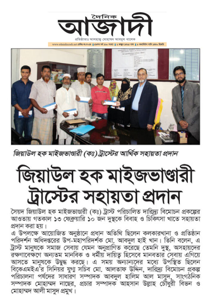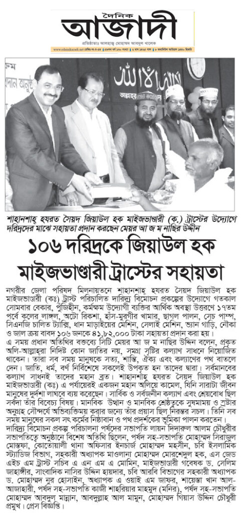 শাহানশাহ হযরত সৈয়দ জিয়াউল হক মাইজভাণ্ডারী (কঃ) ট্রাস্ট পরিচালিত দারিদ্র্য বিমোচন প্রকল্প- এর ব্যবস্থাপনায় সুবিধাবঞ্চিত ৪২৪ জনকে বিবাহ সহায়তা বাবদ প্রদান করা হয় ৯৯ লক্ষ ২৫ হাজার টাকা।