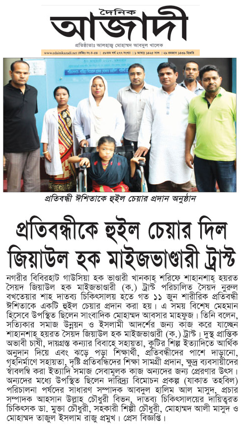 আজ ১১ জুন ২০১৮, নগরীর বিবিরহাটস্থ গাউসিয়া হক ভাণ্ডারী খানকাহ্ শরিফে শাহানশাহ্ হয়রত সৈয়দ জিয়াউল হক মাইজভাণ্ডারী (কঃ) ট্রাস্ট পরিচালিত সৈয়দ নুরুল বখতেয়ার শাহ দাতব্য চিকিৎসালয় হতে শারিরীক প্রতিবন্ধী ঈশিতাকে একটি হুইল চেয়ার প্রদান করা হয়।