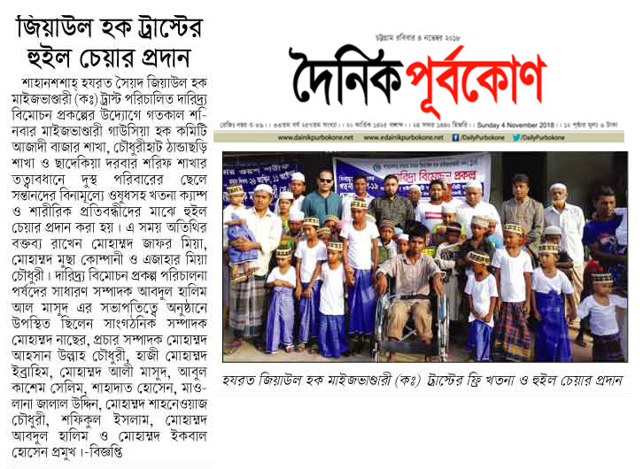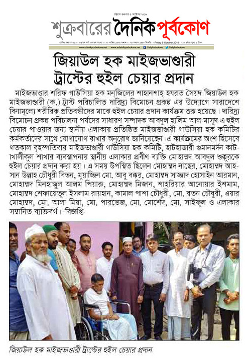 শাহানশাহ হযরত সৈয়দ জিয়াউল হক মাইজভাণ্ডারী (কঃ) ট্রাস্ট পরিচালিত দারিদ্র্য বিমোচন প্রকল্প এর ব্যবস্থাপনায় শারীরিক প্রতিবন্ধীদের মাঝে হুইল চেয়ার বিতরণ।