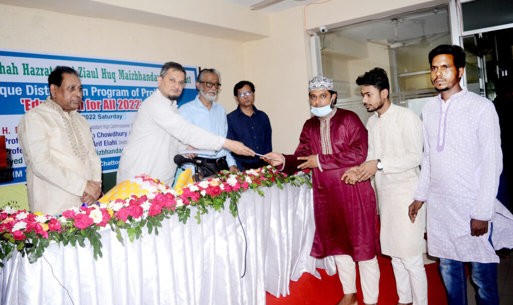 শাহানশাহ্ হযরত সৈয়দ জিয়াউল হক মাইজভাণ্ডারী (কঃ) ট্রাস্ট-এর উদ্যোগে করোনায় বিপর্যস্ত দেশের বিভিন্ন এলাকায় অবস্থিত পিছিয়ে পড়া ২৬টি শিক্ষা প্রতিষ্ঠানকে ‘সবার জন্য শিক্ষা প্রকল্প-২০২২’-এর আওতায় চেক প্রদান অনুষ্ঠান গত ০২ এপ্রিল ২০২২ শনিবার চট্টগ্রাম নগরীর চান্দগাঁওস্থ ‘এস জেড এইচ এম ট্রাস্ট মিলনায়তন’এ অনুষ্ঠিত হয়। ট্রাস্টের মাননীয় ম্যানেজিং ট্রাস্টি সৈয়দ মোহাম্মদ হাসান মাইজভাণ্ডারীর সভাপতিত্বে অনুষ্ঠিত চেক প্রদান অনুষ্ঠানে সম্মানিত অতিথি হিসেবে উপস্থিত ছিলেন বিশিষ্ট সমাজবিজ্ঞানী ও চট্টগ্রাম বিশ্ববিদ্যালয়ের সাবেক উপাচার্য প্রফেসর ড. ইফতেখার উদ্দিন চৌধুরী এবং বিশেষ অতিথি হিসেবে উপস্থিত ছিলেন মাধ্যমিক ও উচ্চ শিক্ষা অধিদপ্তরের (মাউশি) চট্টগ্রাম অঞ্চলের পরিচালক প্রফেসর হোসেন আহমেদ আরিফ ইলাহী। আরো উপস্থিত ছিলেন ট্রাস্টের সচিব অধ্যাপক এ ওয়াই এম জাফর এবং ট্রাস্টের মুখ্য সমন্বয়ক অধ্যাপক জহুর উর আলম।