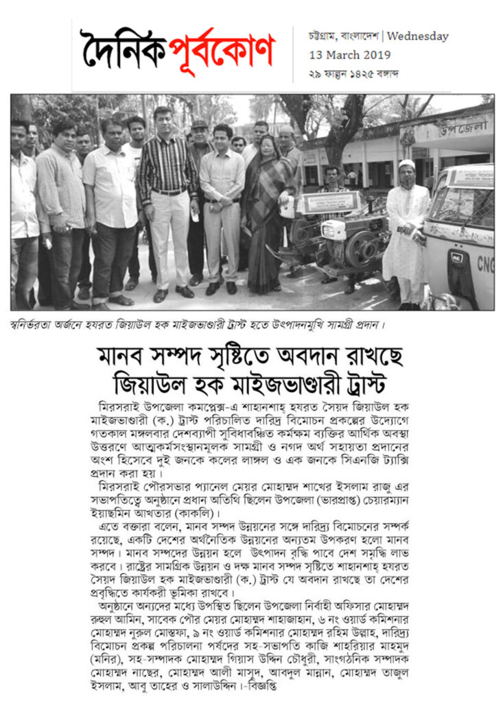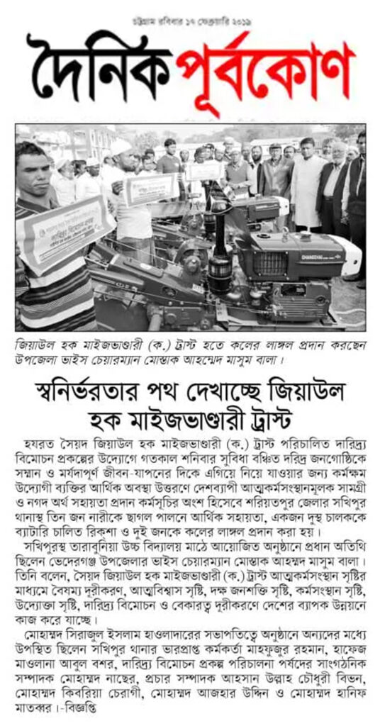 বেকার, পুঁজিহীন, কর্মক্ষম উদ্যোগী ব্যক্তির আর্থিক অবস্থা উত্তরণে, আত্মকর্মসংস্থান সৃষ্টির মাধ্যমে বৈষম্য দূরীকরণ, আত্মবিশ্বাস সৃষ্টি, দক্ষ জনশক্তি সৃষ্টি, কর্মসংস্থান সৃষ্টি, উদ্যোক্তা সৃষ্টি, দারিদ্র্য বিমোচন ও বেকারত্ব দূরীকরণে শাহানশাহ হযরত সৈয়দ জিয়াউল হক মাইজভাণ্ডারী (কঃ) ট্রাস্ট পরিচালিত দারিদ্র্য বিমোচন প্রকল্প এর ব্যবস্থাপনায় ৫৫ জনকে কলের লাঙ্গল ক্রয়ে ৫১ লক্ষ ২৪ হাজার টাকা প্রদান করা হয়।