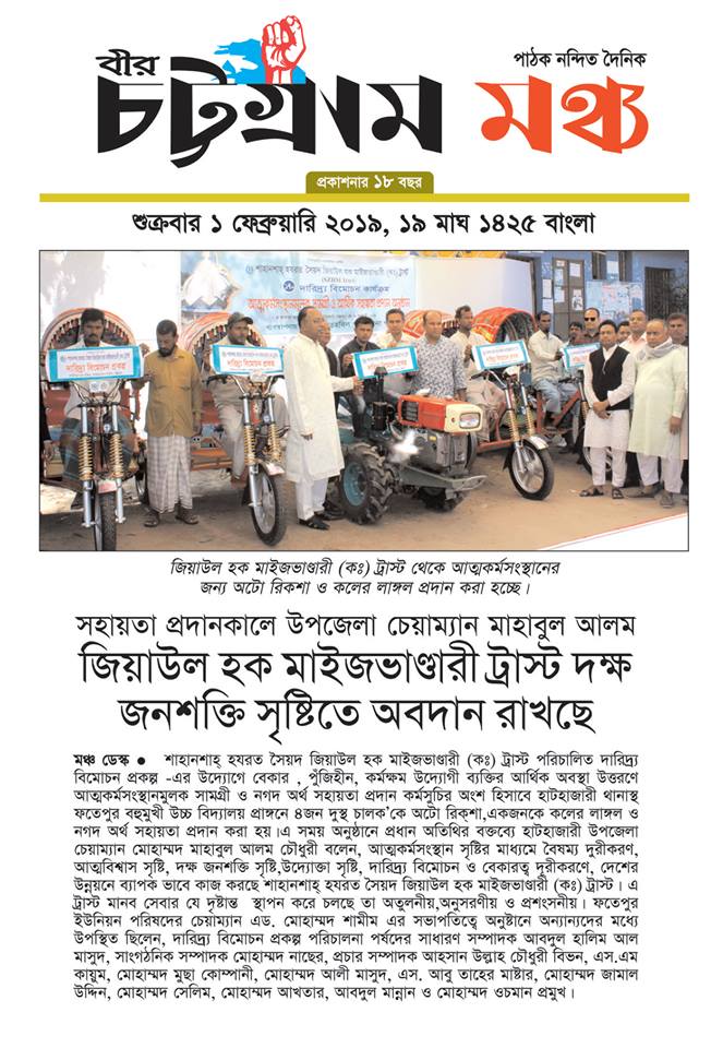 (১৬ ফেব্রুয়ারী ২০১৯, শনিবার) শাহানশাহ্ হযরত সৈয়দ জিয়াউল হক মাইজভাণ্ডারী (কঃ) ট্রাস্ট পরিচালিত দারিদ্র্য বিমোচন প্রকল্প -এর উদ্যোগে সুবিধা বঞ্চিত দরিদ্র জনগোষ্ঠিকে সম্মান ও মর্যদাপূর্ণ জীবন- যাপনের দিকে এগিয়ে নিয়ে যাওয়ার জন্য কর্মক্ষম উদ্যোগী ব্যক্তির আর্থিক অবস্থা উত্তরণে দেশব্যাপী আত্মকর্মসংস্থানমূলক সামগ্রী ও নগদ অর্থ সহায়তা প্রদান কর্মসুচির অংশ হিসাবে শরিয়তপুর জেলার সখিপুর থানাস্থ তিন জন নারীকে ছাগল পালনে আর্থিক সহায়তা, এক জন দুস্থ চালক’কে ব্যাটারি চালিত রিক্শা ও দুই জনকে কলের লাঙ্গল প্রদান করা হয়।